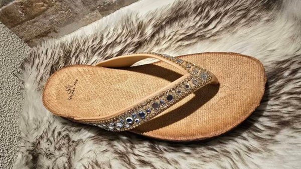 De glinsterende steentjes zorgen voor een luxe uitstraling, terwijl het zachte voetenbed elke stap aangenaam maakt.